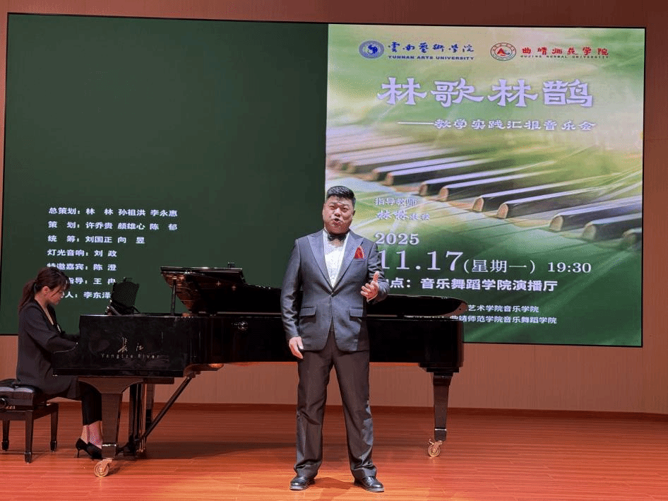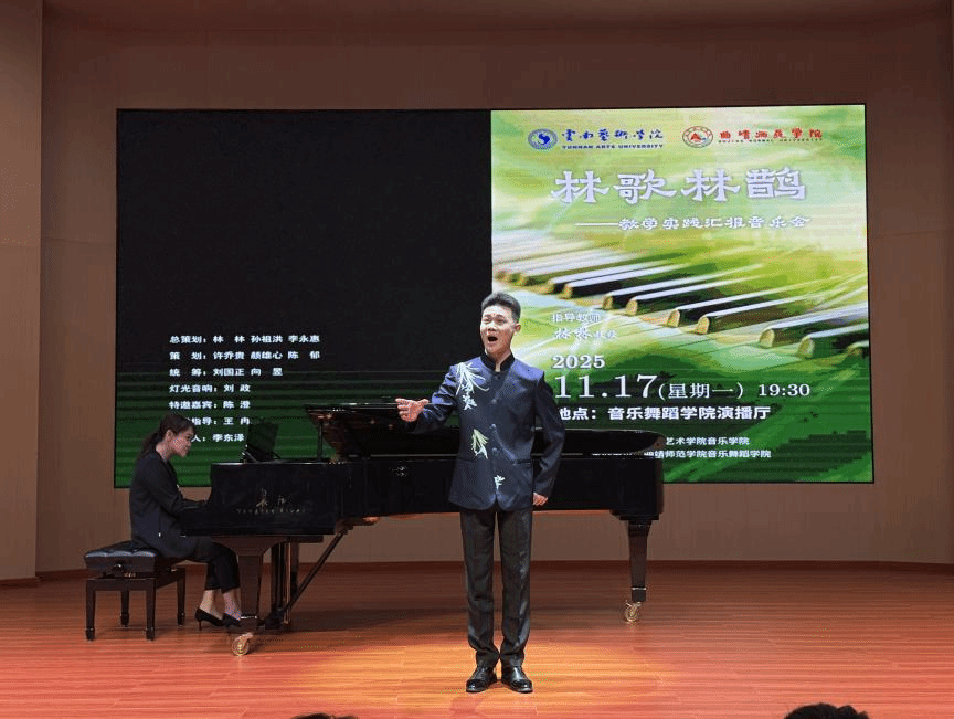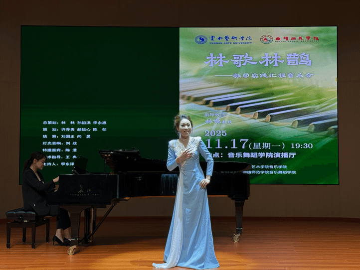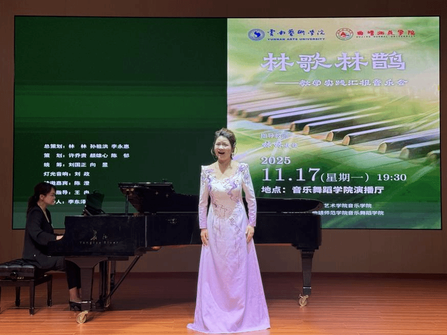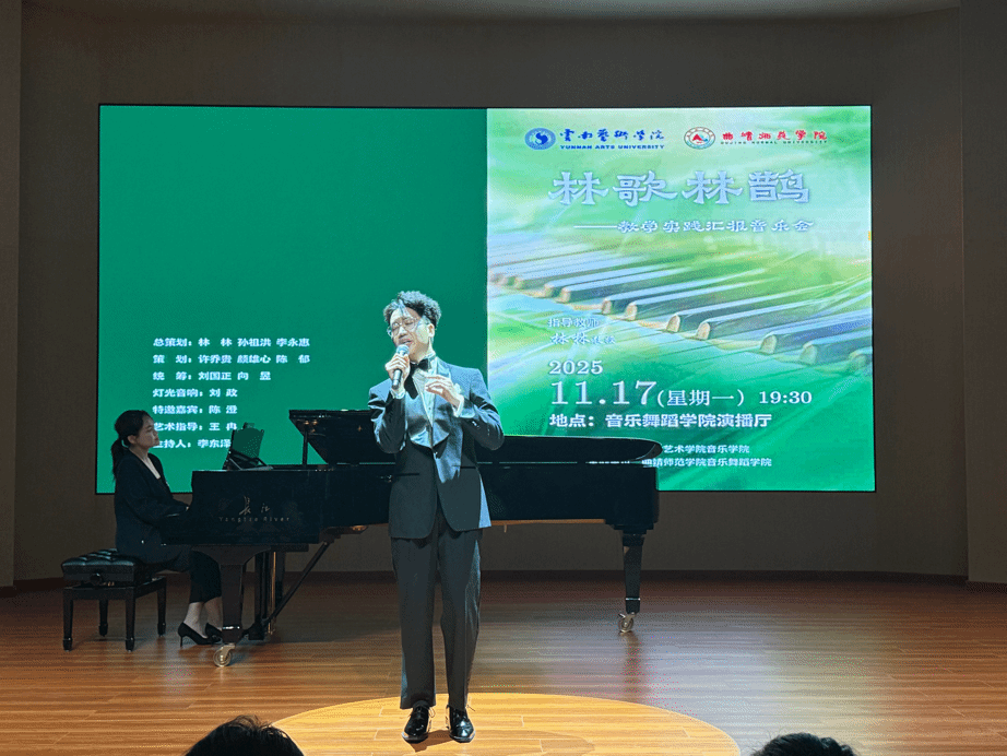 2025年11月17日,“林歌林鹊”——林林教授教学实践汇报音乐会在曲靖师范学院音乐舞蹈学院演播厅圆满举行。此次音乐会由云南艺术学院音乐学院主办,曲靖师范学院音乐舞蹈学院承办。