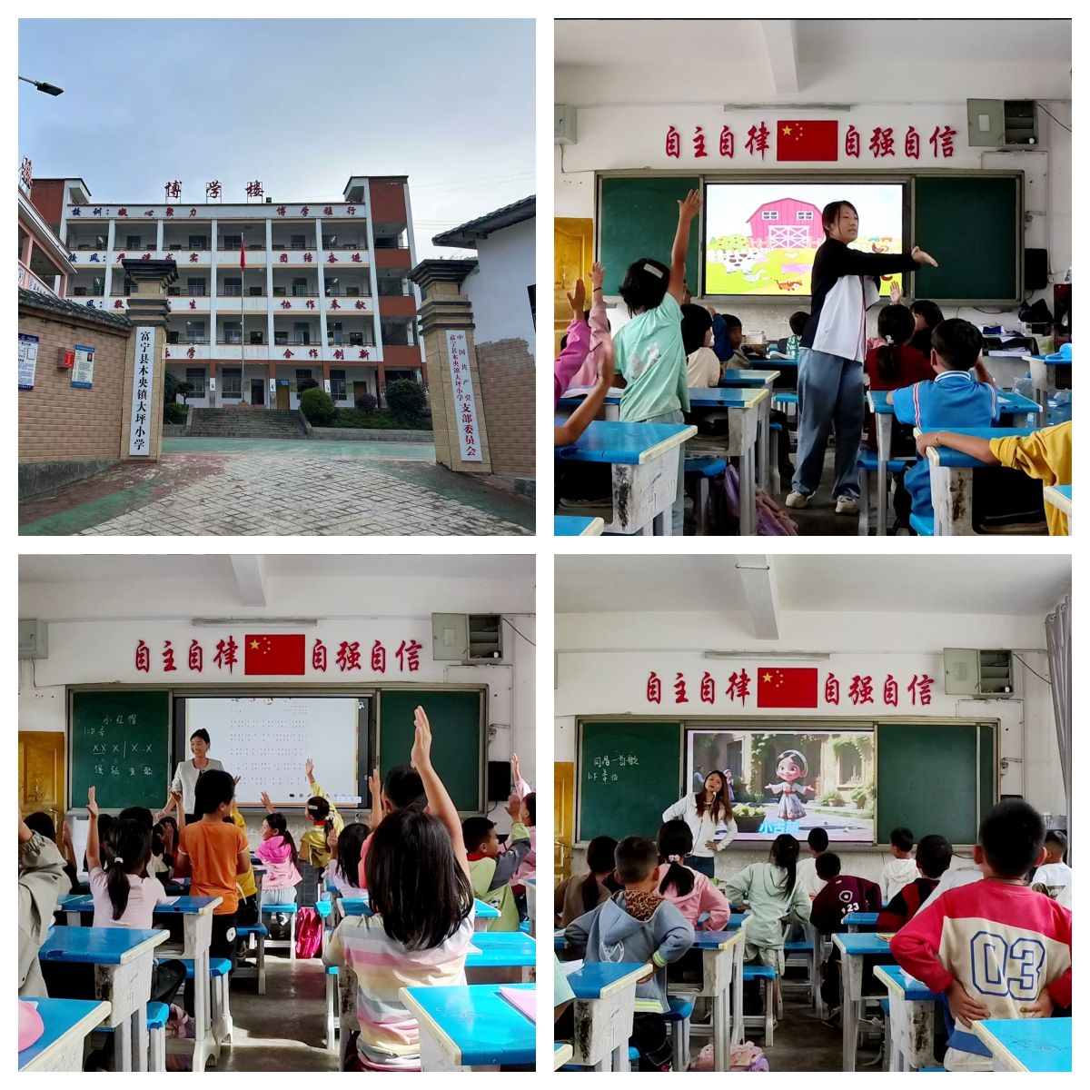 10月中旬,云南艺术学院美育浸润师生团队与富宁县思源实验学校高昂老师团队共同赴富宁县木央镇大坪小学进行巡课走教活动,活动中刘心语老师为一年级2班同学带来的“动物发声”课堂,课堂氛围良好,学生们反响热烈;李佳溪老师为一年级1班同学们带来“小红帽与大灰狼”的故事与歌曲,教会小朋友们要学会聪明地辨别善恶,课堂生动有趣;鲁甜老师为二年级同学们带来了“同唱一首歌”,边教边唱的同时融入了手势舞,歌曲描绘了我国各少数民族同学团结友爱,共同努力奋斗的情境,营造了良好的课堂氛围。本次巡教深入文山州边远地区,切实为国家边远地区学校送来了美育的温暖。课堂上,学生们近乎“疯狂”地配合,下课后,学生们围住支教老师久久不愿离去的场景也感动了在场的每一个人。本次活动丰富了国家边远地区学校音乐艺术教育资源,满足了学生们对于艺术类课程强烈的渴求,开阔了学生的视野,增进了学生对艺术的理解,贡献了云南艺术学院美育浸润行动计划音乐学院师生团队的一份独有的教育力量。
