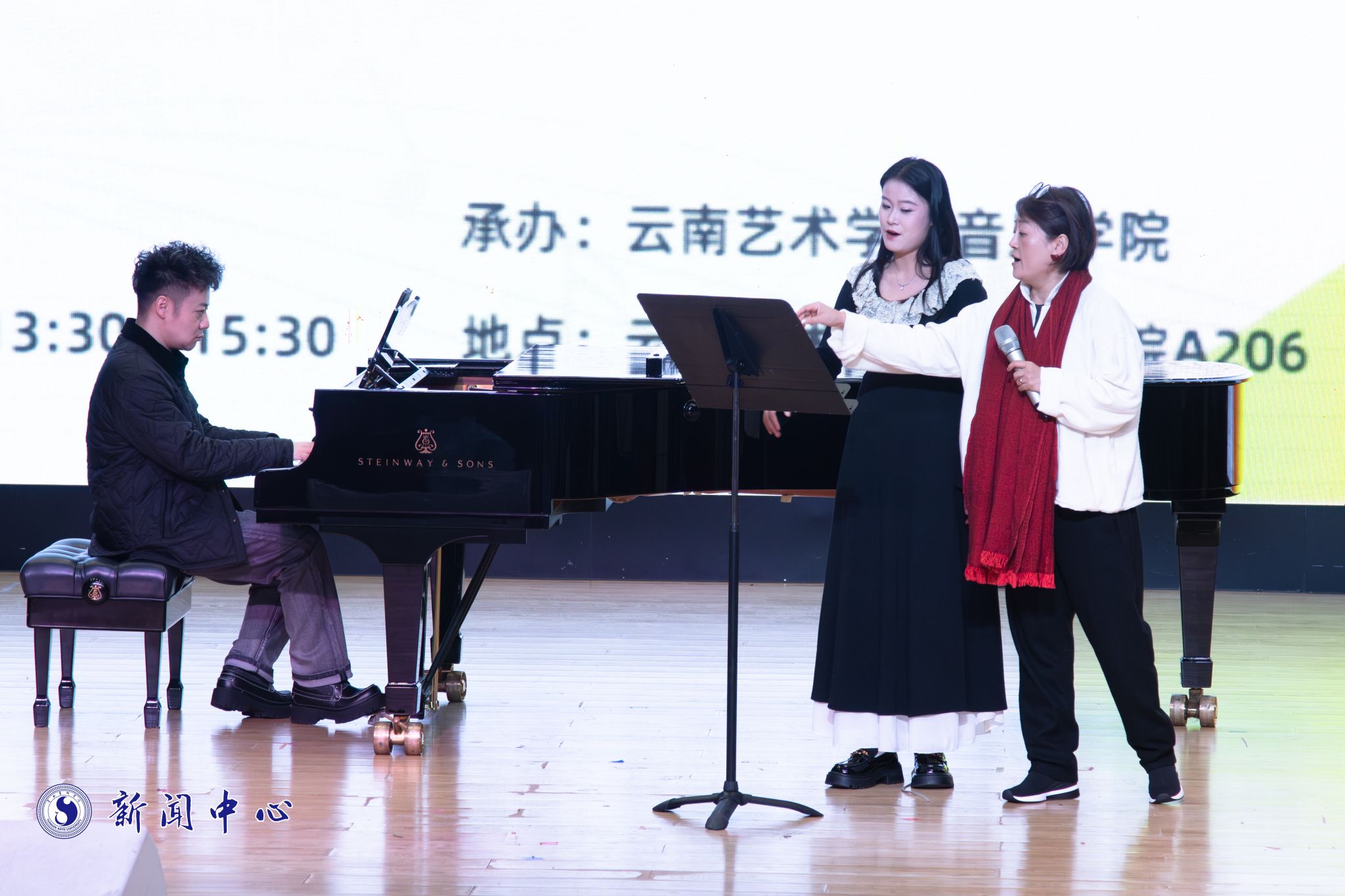 11月9日上午,在安康音乐厅举办了郁钧剑教授“语言决定唱法”专家课。郁钧剑教授围绕当前民族声乐发展现状、歌唱中的“文化存在”、歌唱者机能训练等方面展开讲授,强调中国声乐需坚守民族特色——民族声乐源于百姓生活劳作,在自主知识体系构建中,要守住“专属训练体系”与“独立评判体系”两大底线;教学中需重点解决音域扩展、音量扩大、音质提升、演唱生命力延长四大问题,并建议云南艺术学院在声乐教学中融入本土文化与音乐元素。随后,6名学生先后演唱《黄河里划桨船对船》等作品。郁钧剑教授从作品文化内涵切入,聚焦汉语发音规范,细致讲解“十三辙”音韵知识并开展针对性指导训练。本次专家课反响热烈,师生均表示收获颇丰!