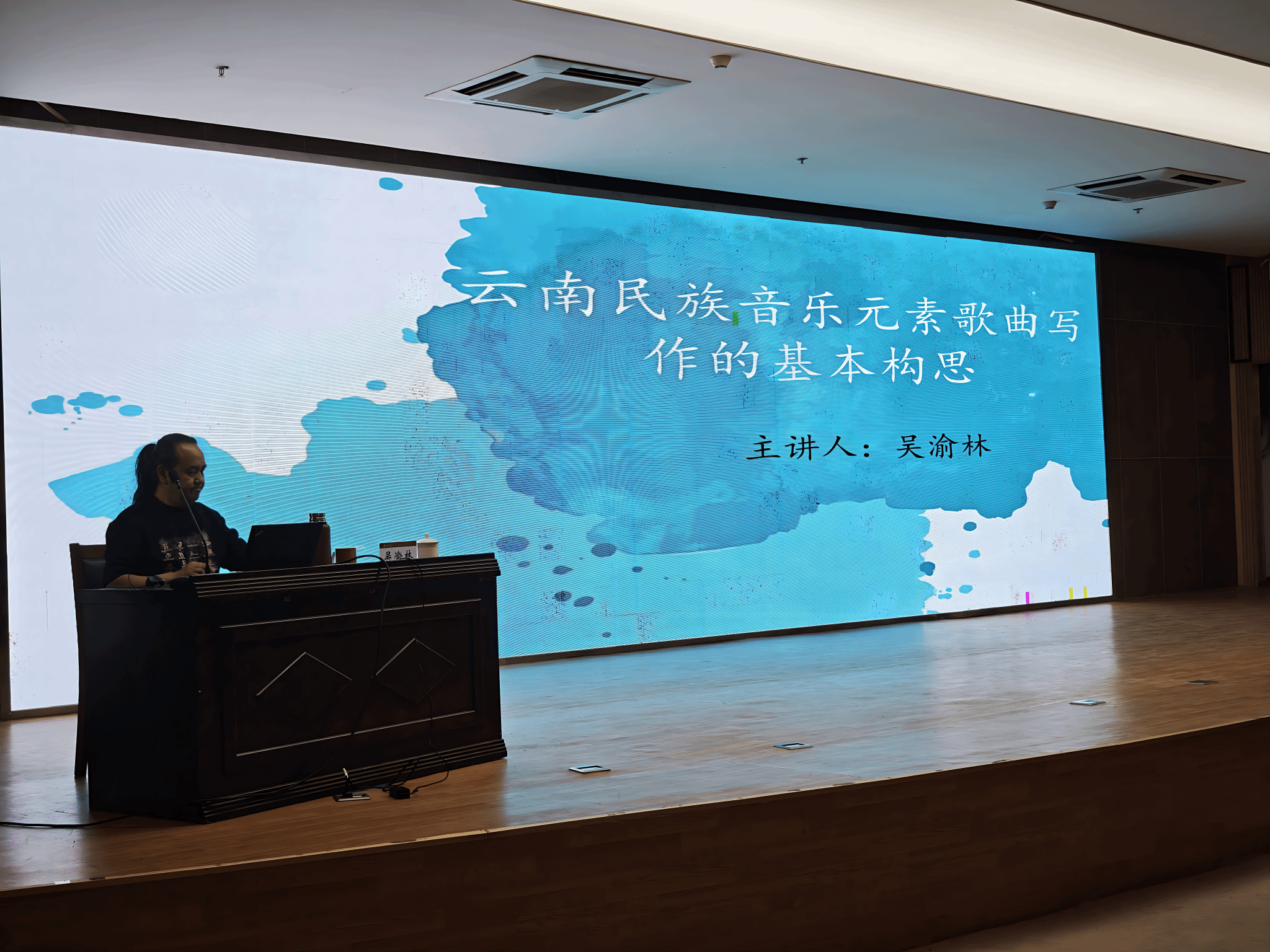 随后,云南艺术学院音乐学院作曲系吴渝林教授以《云南民族音乐元素歌曲写作的基本构思》为主题,为现场师生带来了一场精彩的学术讲座。讲座中,吴渝林教授结合自身多年作曲教学与创作实践经验,围绕云南丰富多样的民族音乐资源,深入剖析了民族音乐元素的艺术特色、旋律特点、节奏韵律等核心内容,系统讲解了将民族音乐元素融入歌曲写作的思路、方法与技巧。并且结合经典音乐作品案例,生动阐释了如何挖掘、提炼、转化民族音乐素材,在保留民族文化精髓的基础上,实现传统民族音乐与现代作曲技法的有机融合,打造兼具民族性、艺术性与时代性的音乐作品。最后,吴渝林教授与现场师生积极互动,耐心解答大家在歌曲创作、民族音乐运用等方面的疑问,现场学术氛围浓厚,进一步拓宽了音乐创作视野,深化了对云南民族音乐文化的认知与理解。