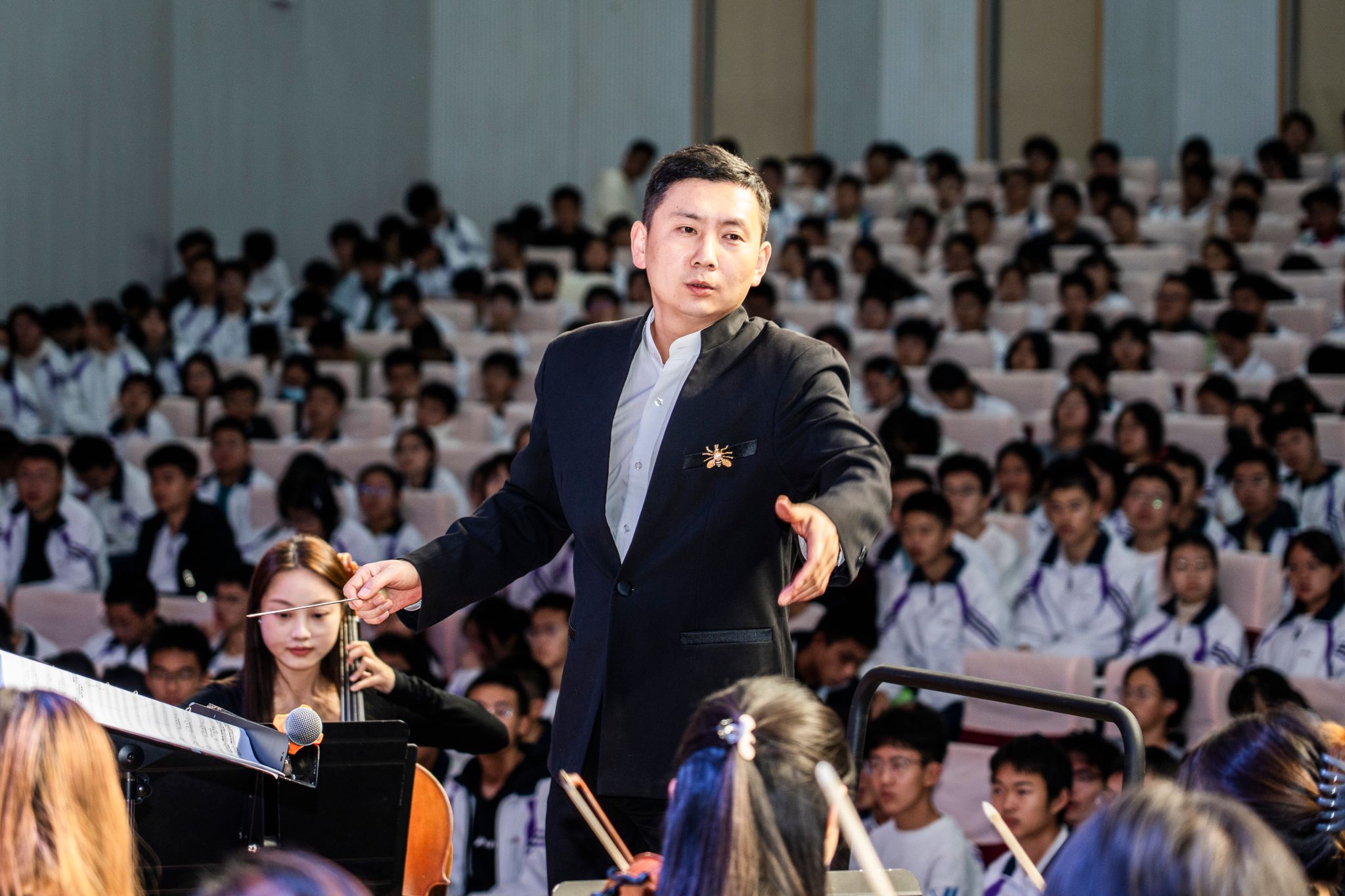 二是互动融合的教学创新。演出间隙设置的“交响乐知识课堂”成为一大亮点。指挥杨凯老师以问答互动形式,生动讲解双管编制、乐器分组等专业知识,现场向踊跃参与的同学赠予指挥棒等,象征艺术火种的传递。这种“演出+讲解”的模式,有效消除了高雅艺术与青少年间的距离感,使音乐会成为沉浸式美育课堂。