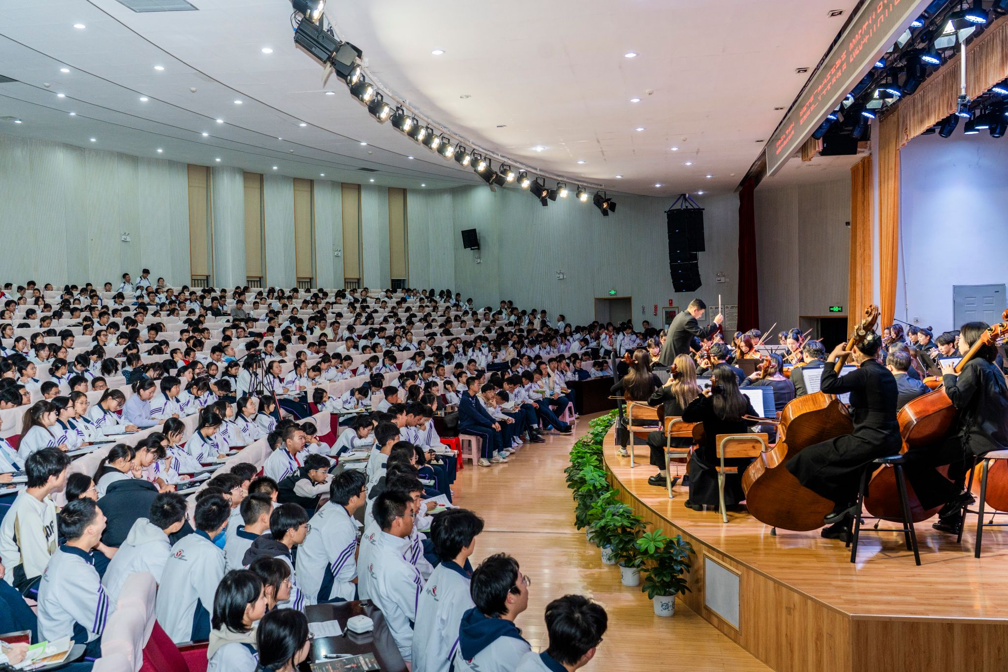 2025年11月11日19:00,昆三中图书馆报告厅座无虚席。云南艺术学院音乐学院教工第二党支部书记、云南艺术学院青年交响乐团指挥杨凯带领乐团师生,为昆三中千余名师生呈现了一场震撼心灵的交响盛宴。作为双方党组织共建的年度重点项目,本场音乐会具有三大特色: