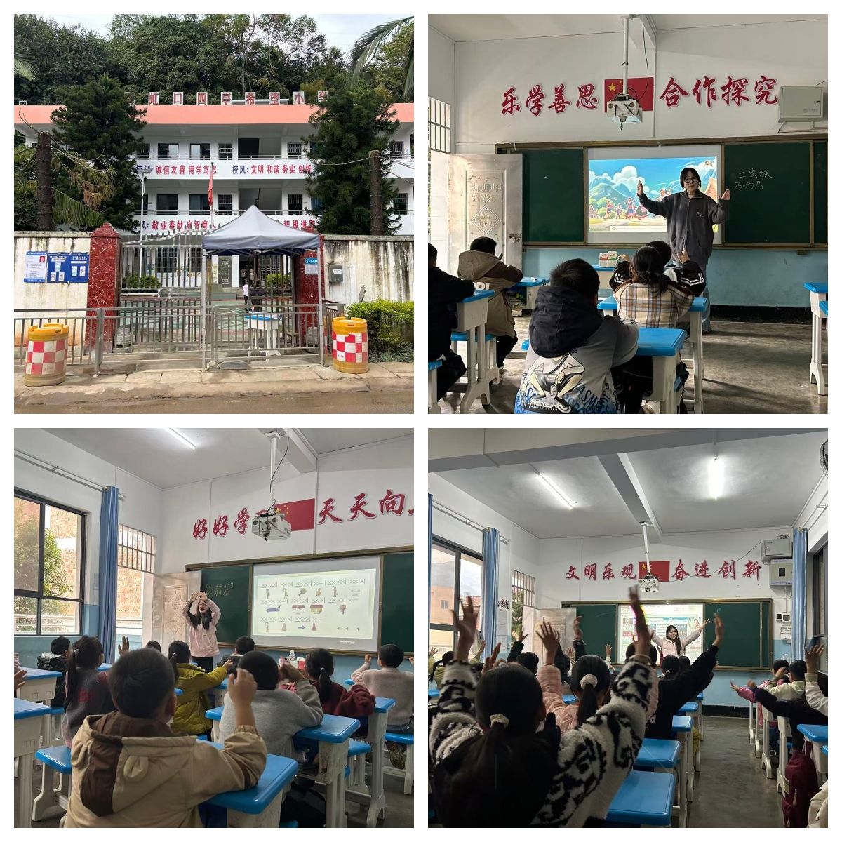 12月中旬,音乐学院团队赴富宁县板仑乡那马希望小学、四亭希望小学开展巡课送教,团队成员郑依沁为一年级同学们带来了“粉刷匠”歌曲课堂,朗朗上口的旋律吸引同学们纷纷大声歌唱;郑媛为二年级同学带来了土家族歌曲“乃哟乃”的教学课堂,并带领学生跳起摆手舞,感受少数民族的多样音乐文化;陈雨晗为三年级同学带来了“歌声与微笑”歌曲,耳熟能详的旋律配合肢体律动,音乐艺术课堂的感染力得到了充分的展现。团队本次巡课送教为当地学校的音乐美育教育奉献了一份力量。