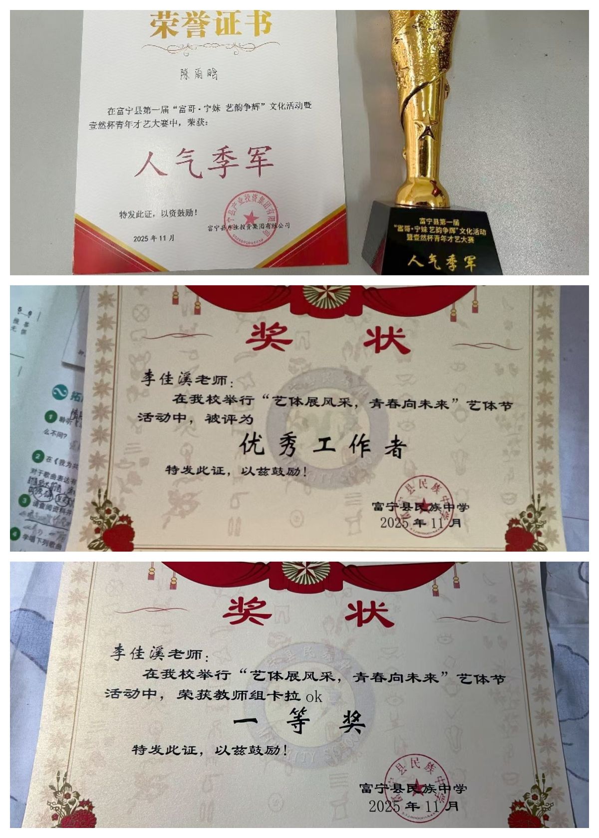美育浸润团队成员还积极参与到富宁本地及驻点学校的各项音乐艺术比赛中,陈雨晗同学在第一届“富哥·宁妹 艺韵争辉”文化活动暨壹然杯青年才艺大赛中荣获人气季军,李佳溪同学在富宁县民族中学第八届校园艺体节活动中获评优秀工作者称号,同时在校园艺体节系列晚会教师卡拉OK比赛中获得民中教师组一等奖。