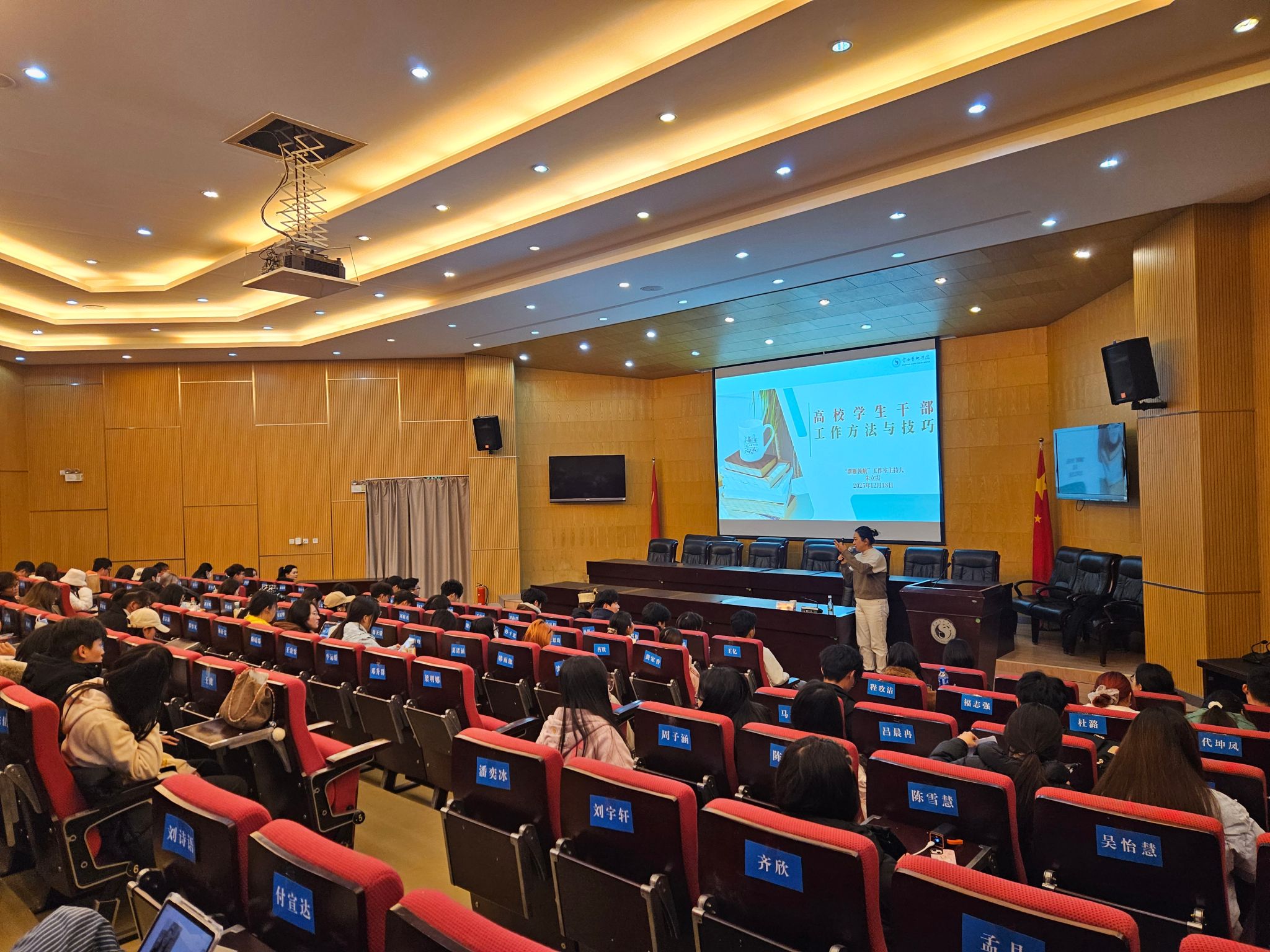 12月18日18:00,戏剧学院学生管理科科长、云南艺术学院“群雁领航”辅导员工作室主持人朱立霞老师以《高校学生干部的工作方法及技巧》为题展开分享。她结合自身工作经验,从“摆正位置,明确角色”这一核心理念出发,结合生动案例,详细讲解了沟通协调、活动策划、问题解决等方面的实用方法与技巧,帮助学生干部厘清工作思路,提升组织管理能力和团队协作水平,增强在实际工作中化解矛盾、推动落实的本领。