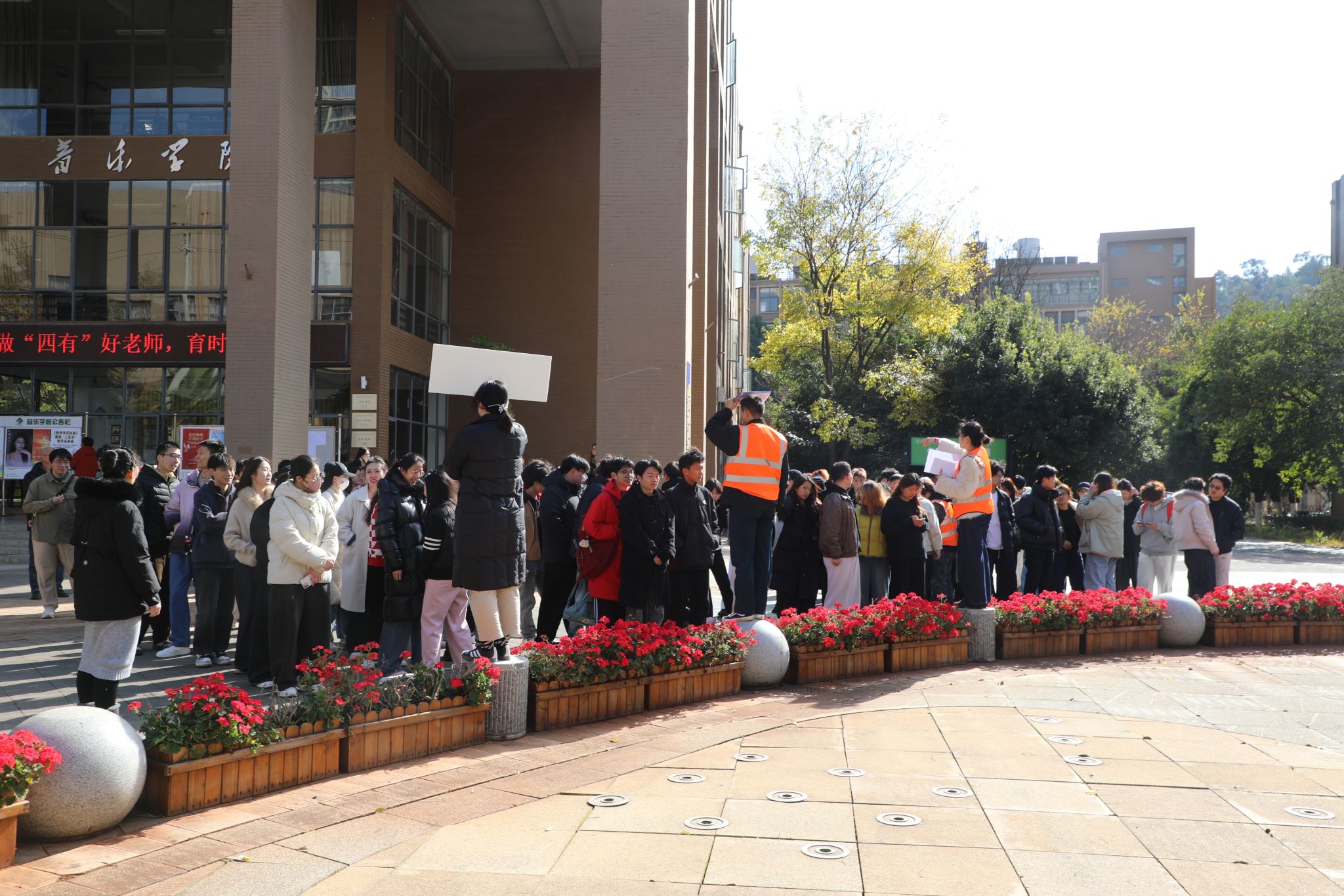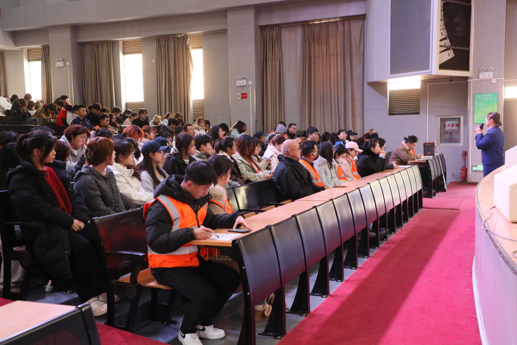 随后,应急疏散演练模拟安康音乐厅观众席发生火情。警报响起,各工作组迅速响应,引导师生按照规范动作沿指定路线安全、有序撤离至学院楼下空地集合点。整个疏散过程紧张有序,未发生拥挤、踩踏情况,达到了预期效果。