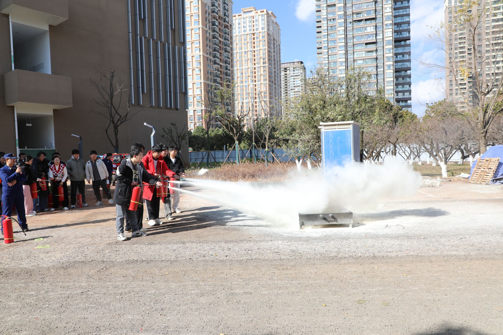疏散演练结束后,全体参加演练的师生转移至学校5号楼旁空地参加灭火演练。消防员结合实战需求,现场开展消防器材实操教学,系统演示了灭火器、消火栓及呼吸罩的正确使用方法。在专业指导下,教师及学生代表共20余人分批次进行了灭火器实操演练,亲身体验了灭火过程,进一步掌握了消防器材的实际应用技能。